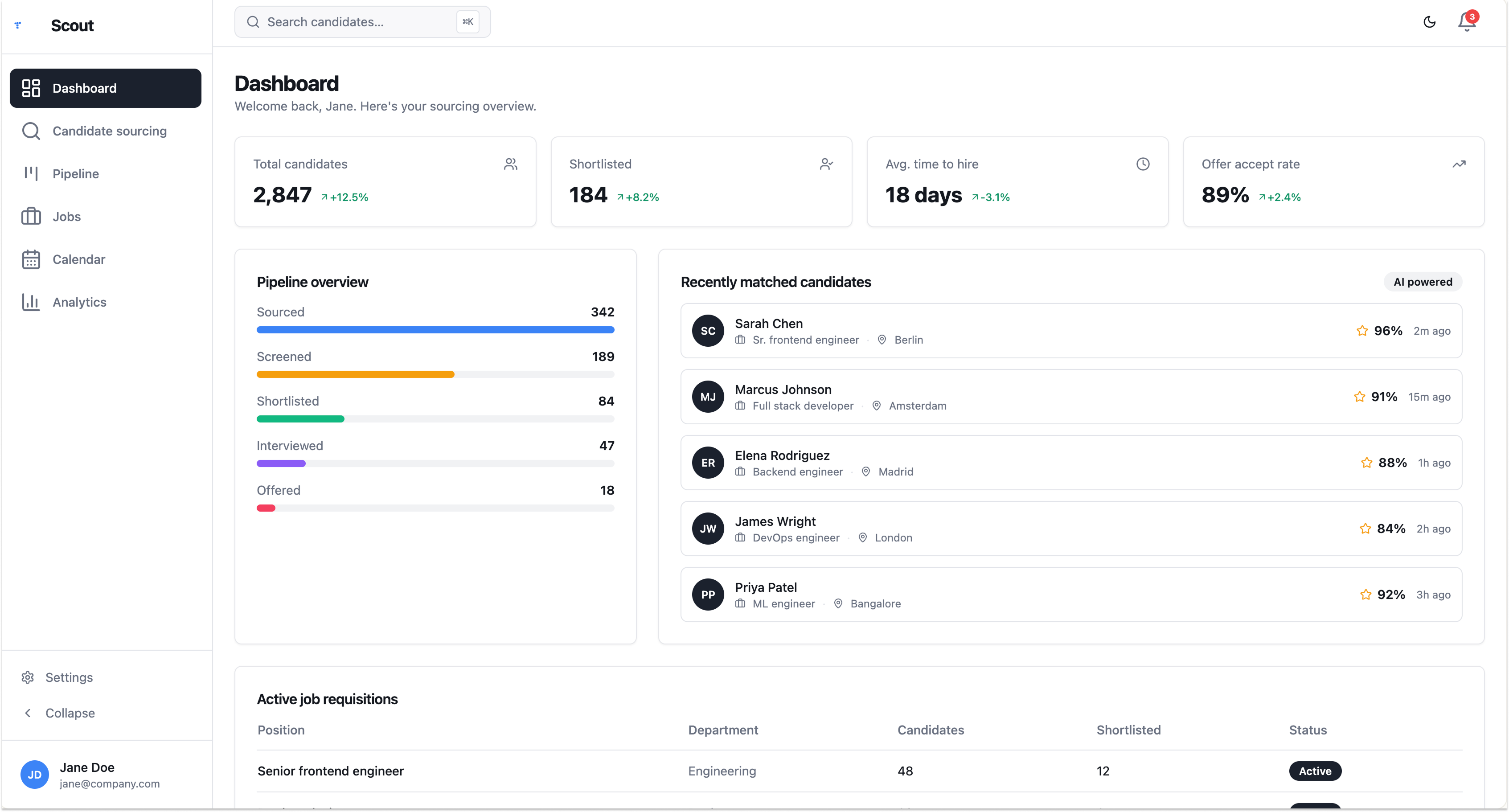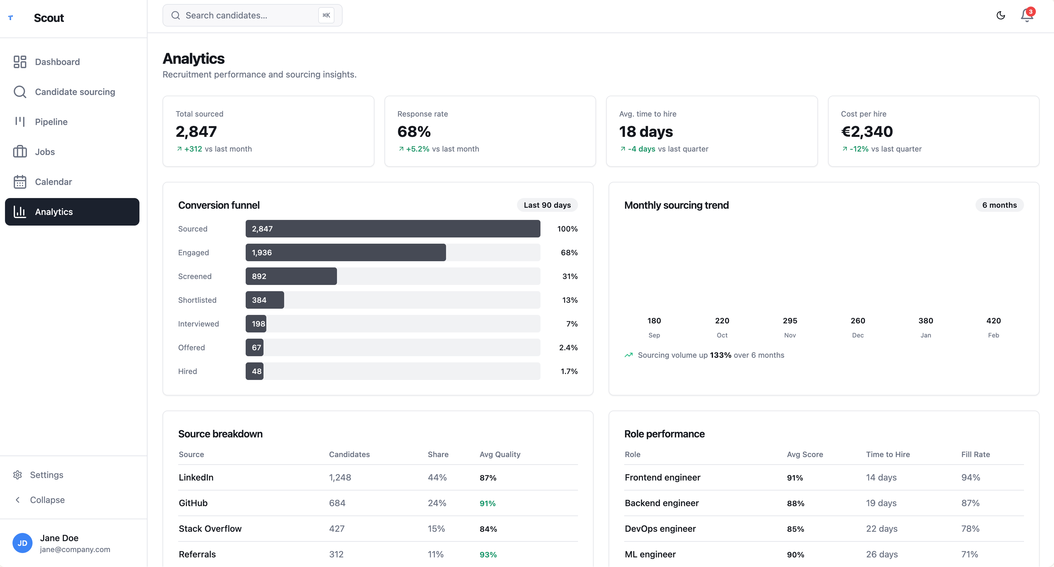 Source at 10x the speed with assisted boolean search on 30+ platforms, robust contact finding, and 24/7 AI sourcing. Quickly find the right fit with thorough candidate profiles and analytics based on data gathered from across the web.