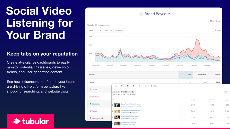 We rely on Tubular for social media strategy. The platform has continuously improved over the past 7 years I have used it. It's hands down the most comprehensive Video Analytics tool on the market.