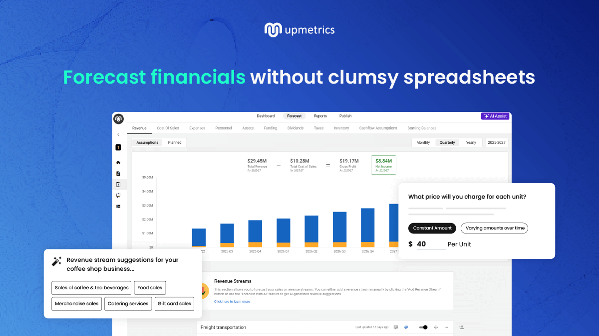 Upmetrics’ AI business plan generator gives me a strong draft right away, and the forecasting tools take the stress out of the financials. Since all my work stays in one place, I can just focus on finishing my plan instead of messing around with spreadsheets. Review collected by and hosted on G2.com.