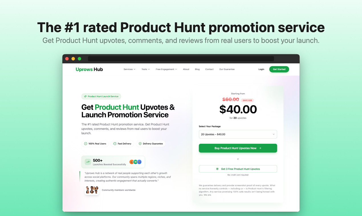 Uprows Hub is a Product Hunt promotion platform that helps startups, indie makers, and founders gain real upvotes, comments, and early traction during launch day. It is designed to support Product Hunt launches by driving authentic engagement that improves ranking, visibility, and chances of getting featured.