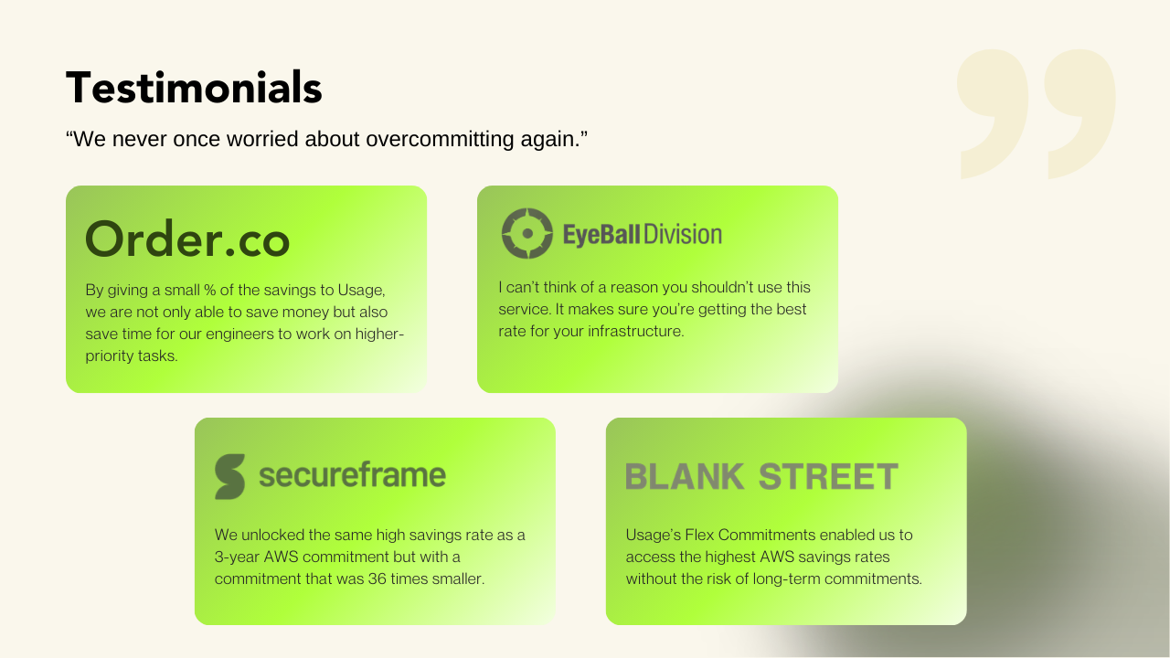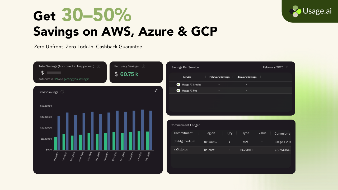 Usage AI is an automated cloud cost optimization and commitment management platform built for modern FinOps and engineering teams. We help companies maximize their cloud investment across AWS, Azure, and GCP by eliminating commitment waste and unlocking 30–50% savings with real cashback, $0 upfront, and no long-term lock-in. Onboarding takes just five minutes.
