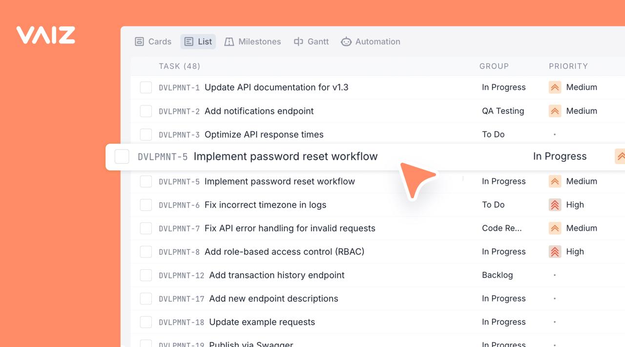 Vaiz List view — a clean, spreadsheet-style layout for tracking 48 development tasks with task IDs, statuses (To Do, In Progress, QA Testing, Backlog), and priority levels in one place.