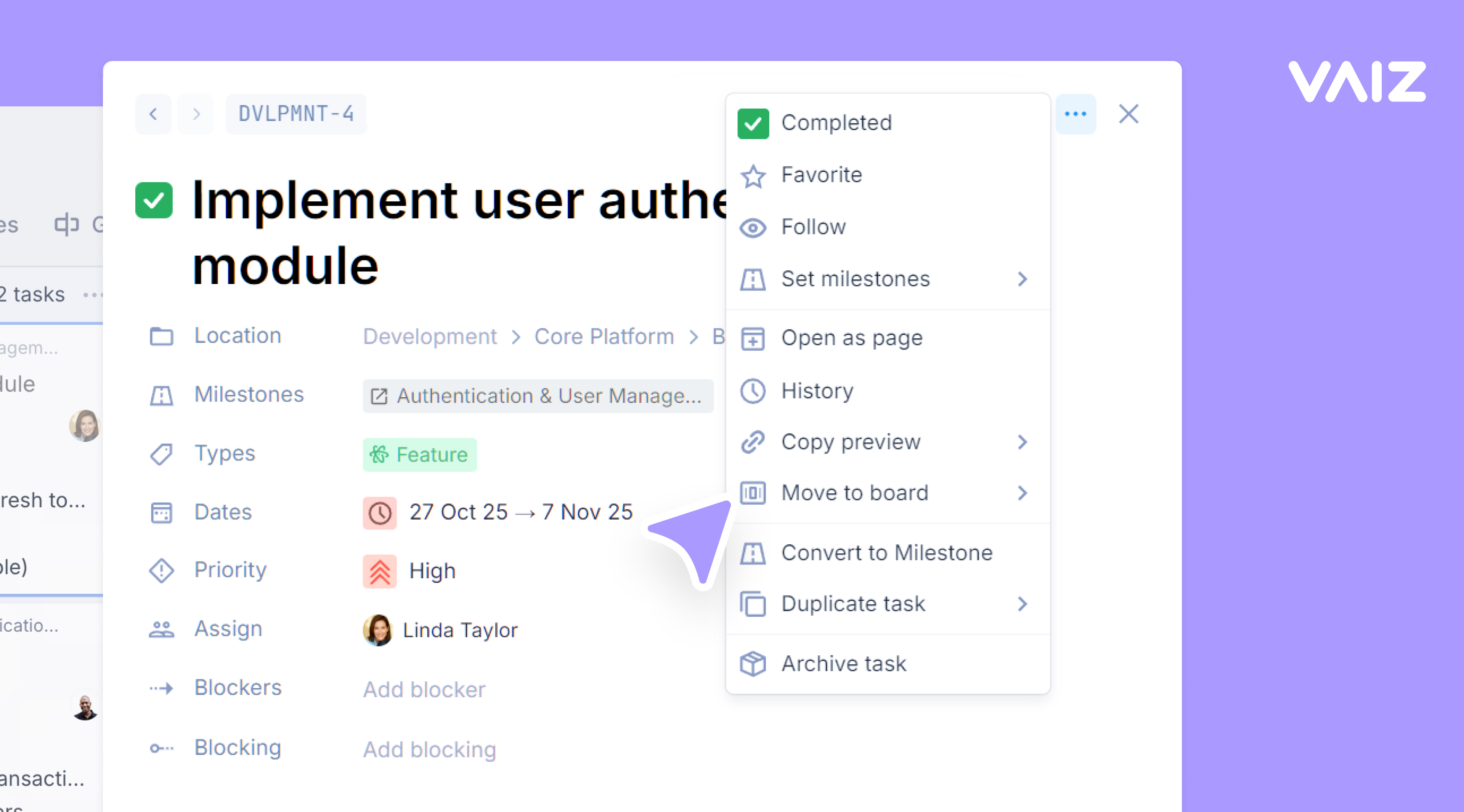 Vaiz task detail view — showing all key task fields in one place: location breadcrumb, milestone, type, dates, priority, assignee, and dependency links (blockers/blocking), with a context menu for quick actions like move, duplicate, convert to milestone, or archive.