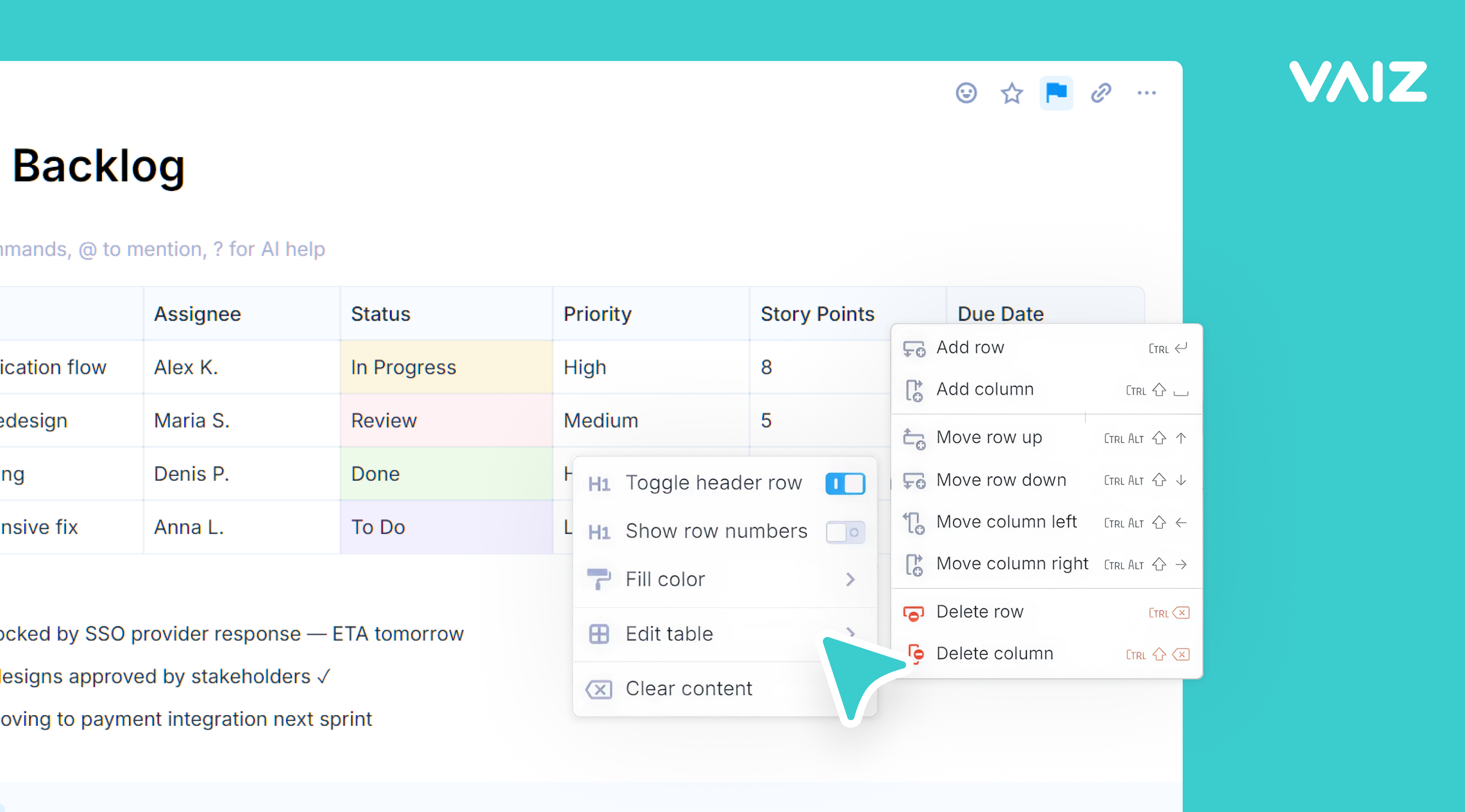 Vaiz document view — a rich-text editor with an embedded table for sprint backlog tracking, showing assignees, statuses, story points, and due dates, with inline table editing controls for structuring sprint data alongside freeform notes.