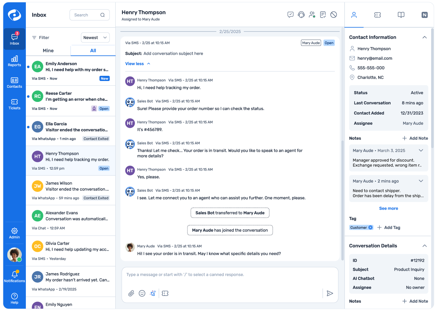 Manage every interaction from live chat, SMS, WhatsApp, Messenger, and voice, from one central inbox. Agents see the full conversation history, contact details, and integrated tools to respond quickly with complete context. AI writing assistance helps maintain speed and consistency in replies.