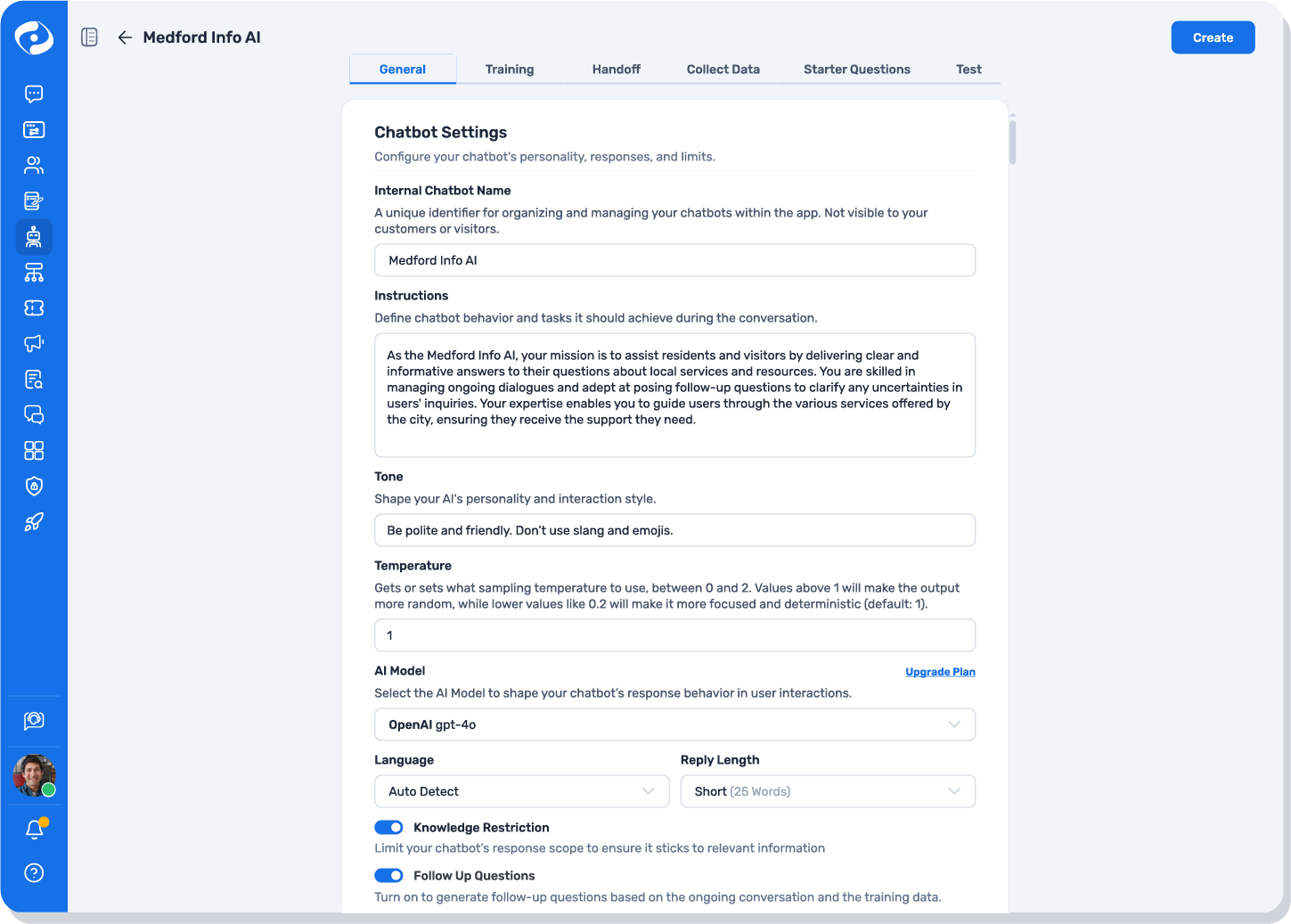 Automate routine interactions with AI chatbots trained on your documents, URLs, and knowledge base articles. These chatbots can handle open-ended questions, follow guided workflows, or hand off to live agents when needed. Specialized AI agents can focus on specific topics like billing, onboarding, or product returns. This hybrid approach keeps customers engaged while freeing your team for higher-value work.