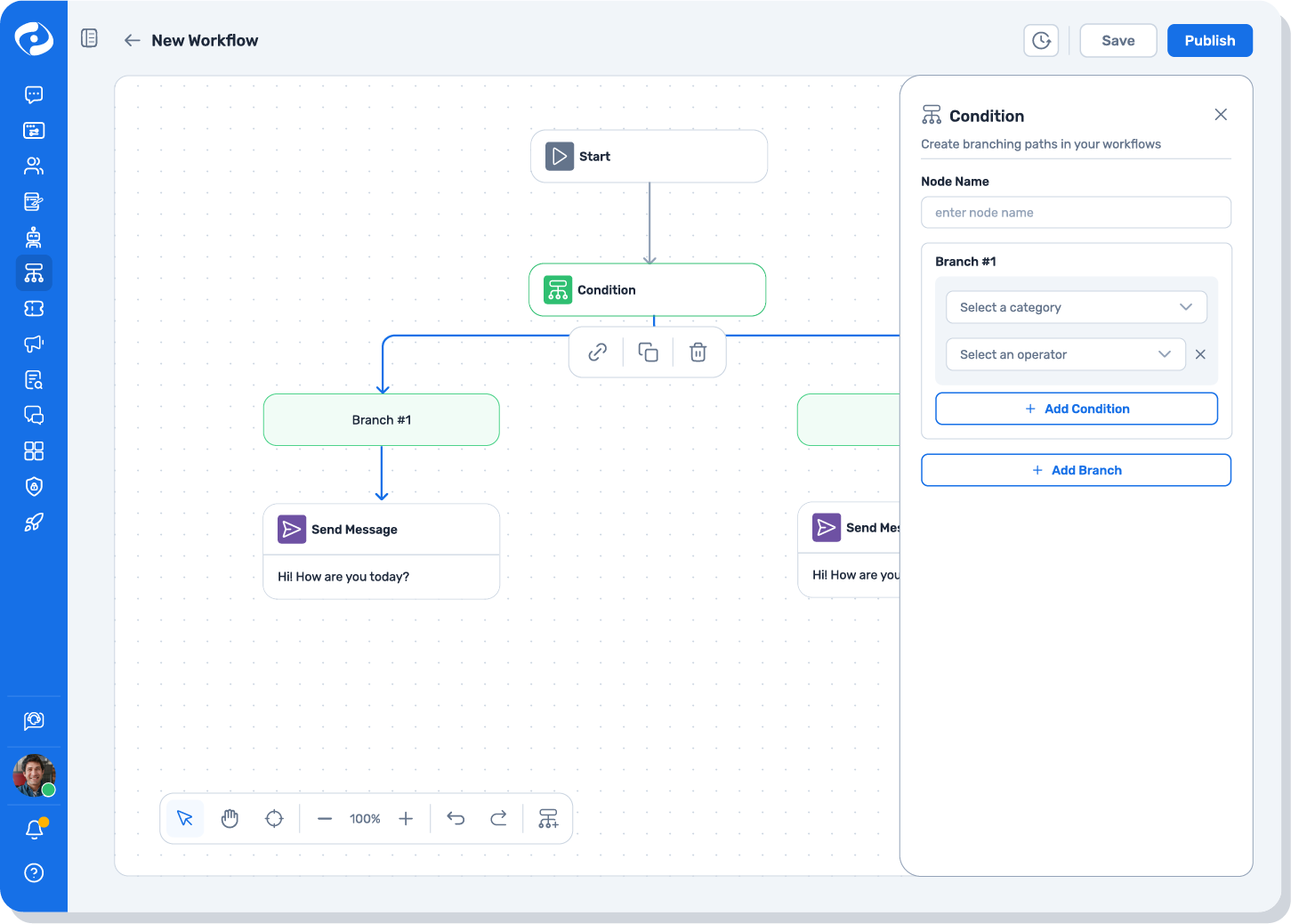 Map customer journeys visually and build automation logic without coding. Set conditions, triggers, and actions to guide interactions from first contact through follow-up. Workflows can be tailored for lead capture, self-service, proactive messaging, or case management, ensuring every step aligns with your business process.