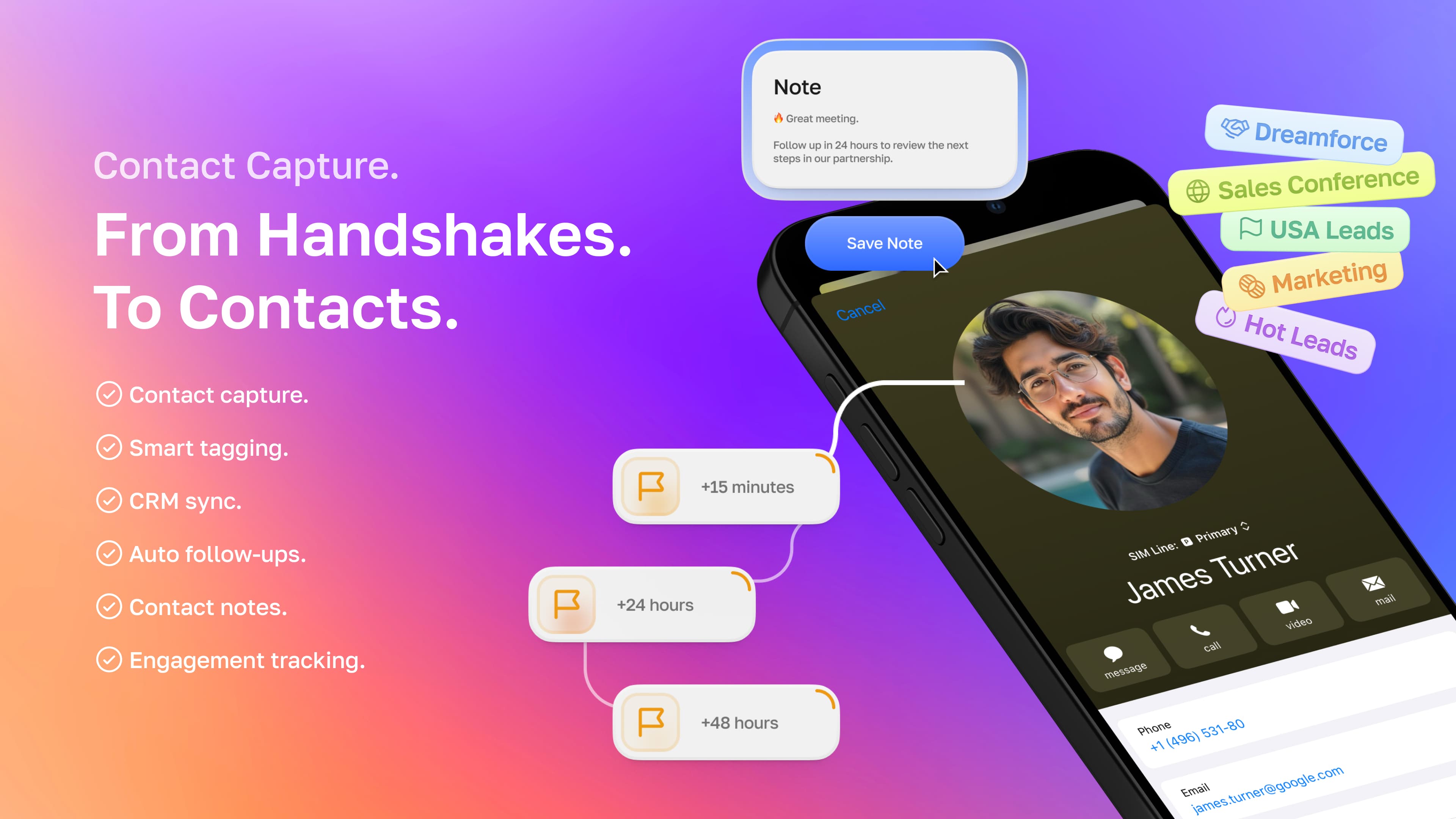 Capture new contacts with a single tap and ensure every opportunity is saved and actionable. VennCard makes it easy to organise, manage, and grow your network from one intuitive platform. Whether you’re meeting someone at an event, in the office, or online, your connections are instantly logged, ...