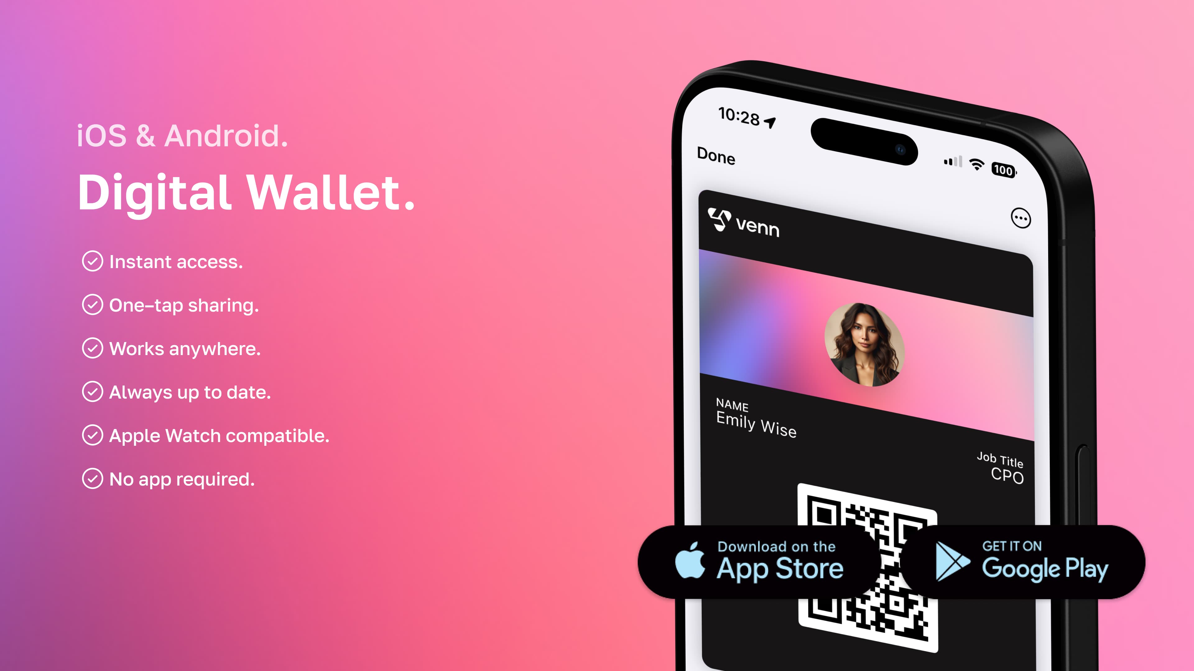 Store your VennCard in Apple Wallet or Google Wallet for instant, hassle-free sharing. No apps, no extra cards, just tap and connect directly from your phone, wherever you are.