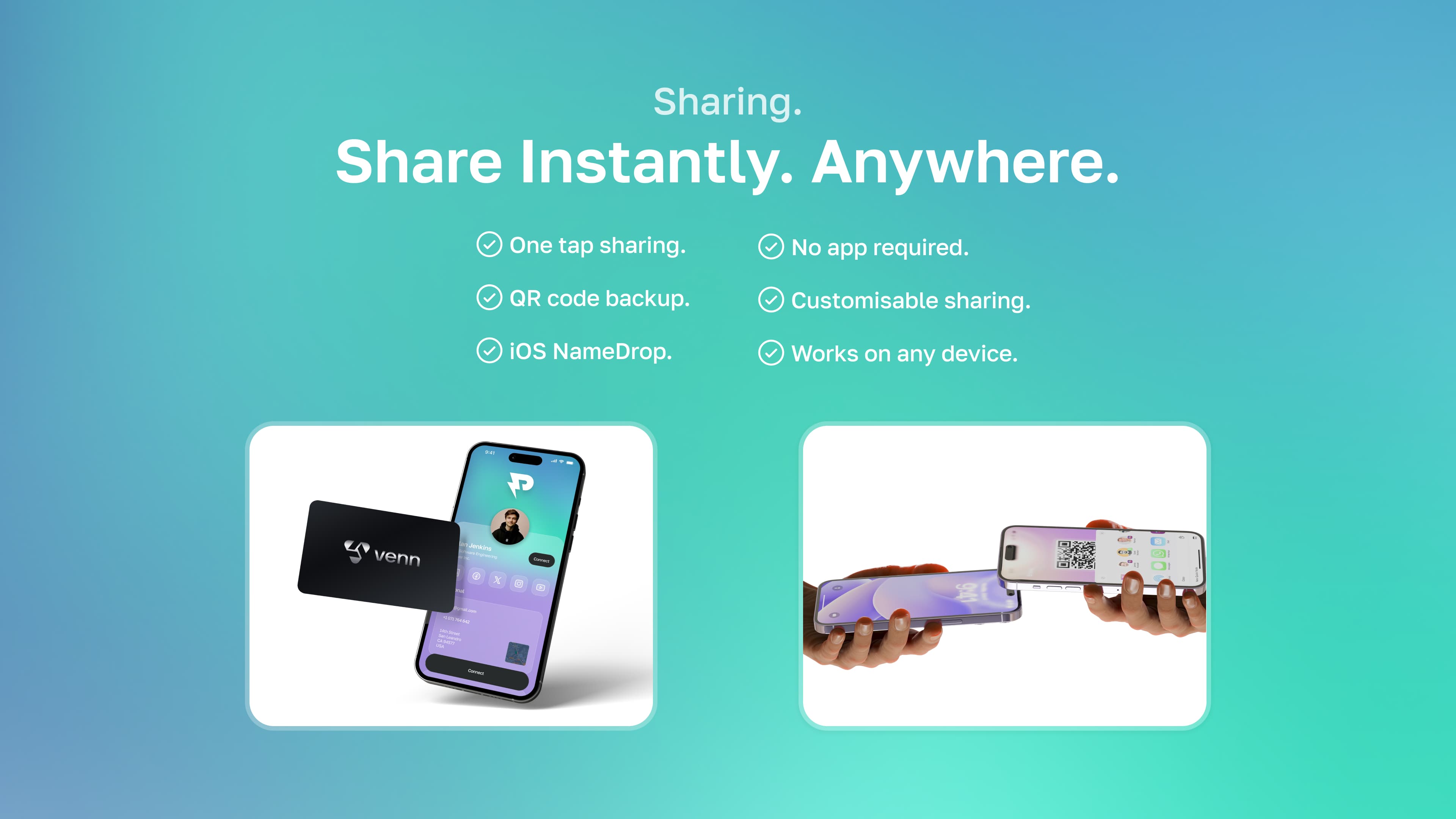 One tap is all it takes. Share your details instantly using NFC, QR code, or through your favourite apps. No downloads, no friction, and no barriers. Whether you’re connecting in person or online, VennCard makes every introduction seamless and professional.