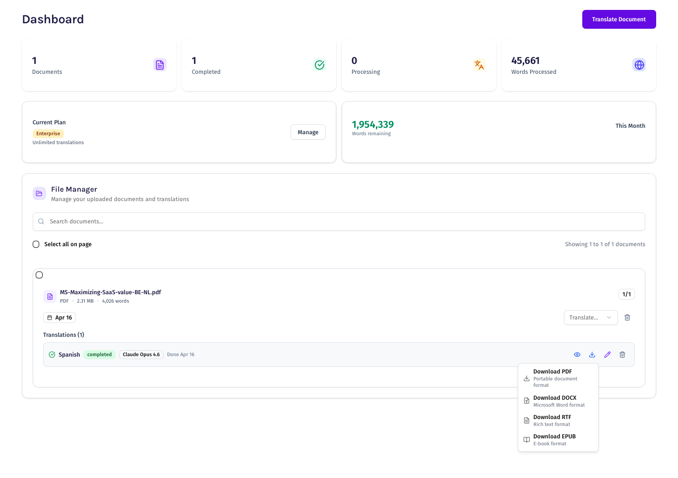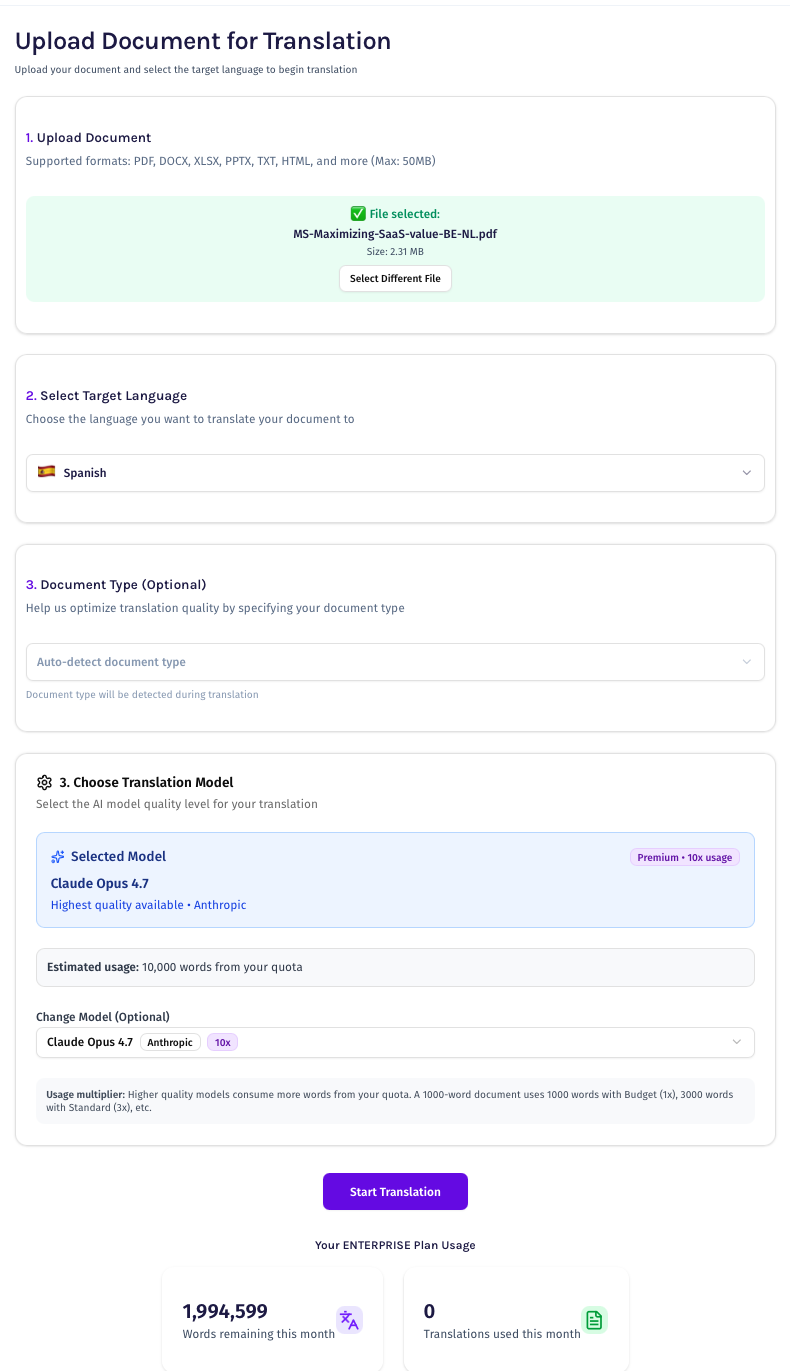 - Document Translation: Supports translation of various document formats, including Word and PDF files.