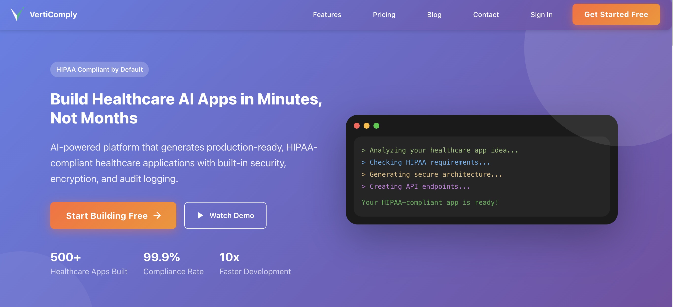 VertiComply is an AI-powered healthcare application builder that generates production-ready, compliant code from natural language descriptions. Instead of spending months building compliance infrastructure, developers and healthcare teams describe their app idea and VertiComply generates the full application — backend, frontend, mobile, and infrastructure — with HIPAA, GDPR, SOC 2, and HITRUST compliance built in from day one.