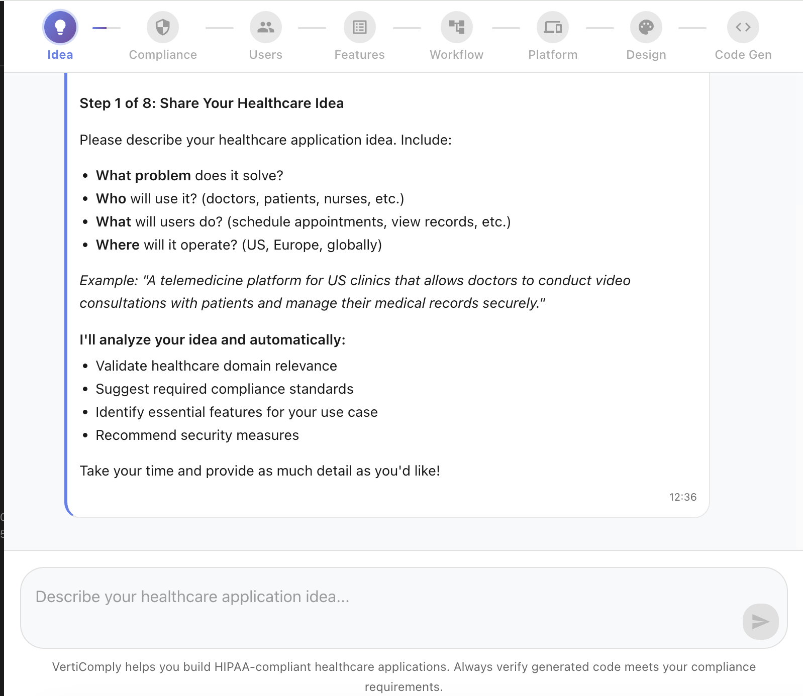 • Code Editor — Inline editing with AI-assisted modifications post-generation VertiComply serves healthcare startups, hospital IT teams, digital health agencies, and compliance-focused development teams who need to ship secure healthcare software fast without compromising on regulatory requirements.