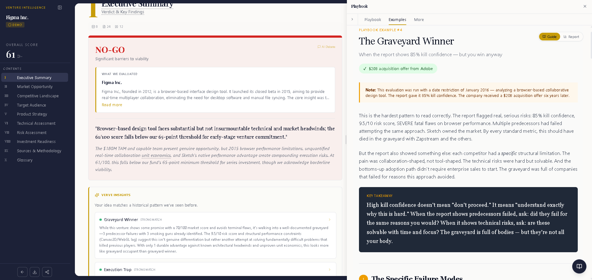 Verve Intelligence is a startup validation platform that delivers investor-grade startup due diligence reports, helping founders and entrepreneurs understand why startups fail before they build. The platform functions as an AI-powered startup idea evaluator, producing comprehensive analysis that surfaces the risks institutional investors would identify—at a fraction of the cost and time of traditional due diligence for startups.