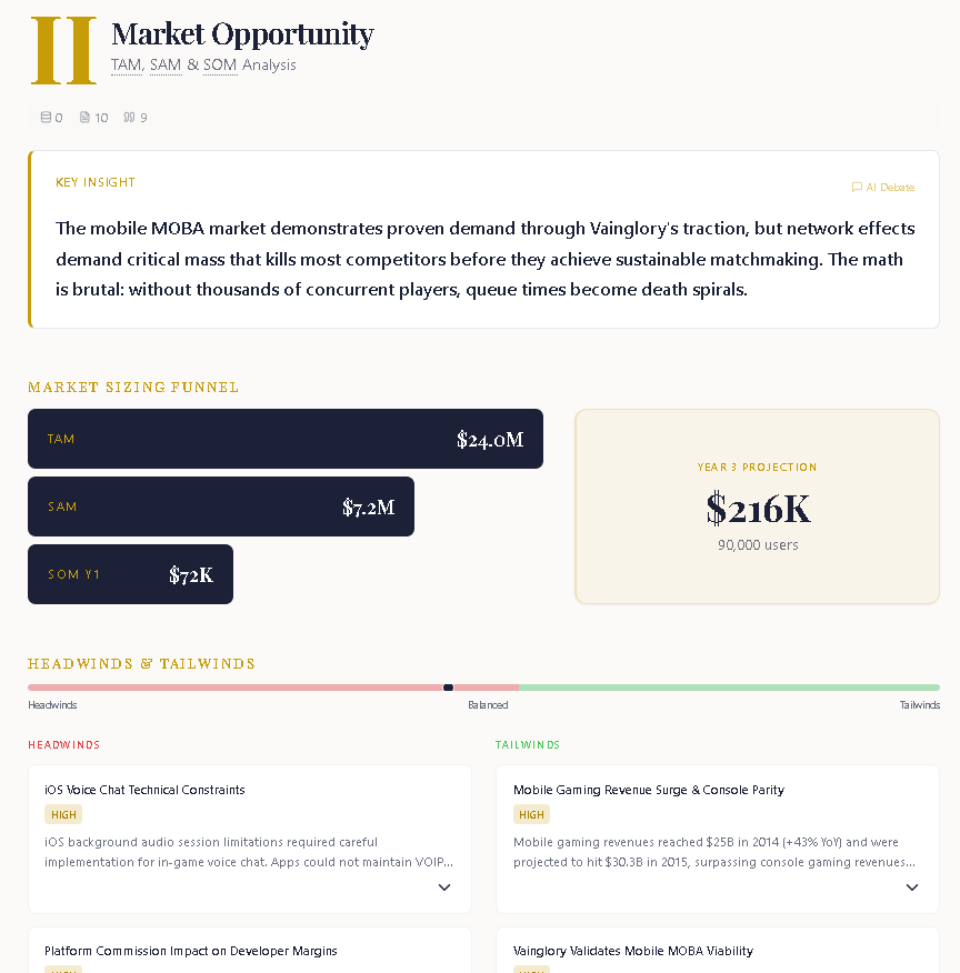 1. Market opportunity analysis — Bottom-up TAM, SAM, and SOM calculations with supporting methodology. Identifies market headwinds and tailwinds affecting growth potential, helping founders evaluate startup ideas with the same rigor VCs apply during VC due diligence.