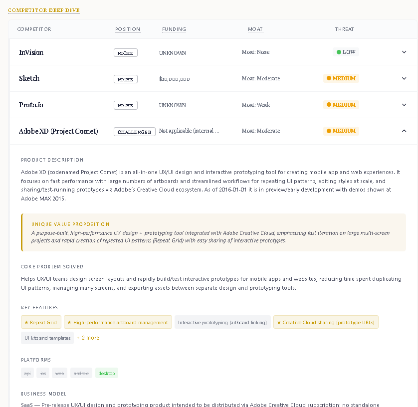 2. Competitive intelligence — Detailed profiles of direct and indirect competitors including funding history, positioning, moat strength, and threat level assessment. Surfaces why SaaS startups fail, why fintech startups fail, and category-specific risks based on competitive dynamics.