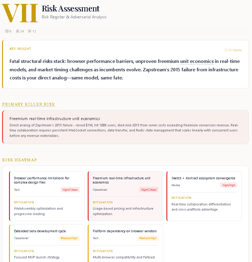 Reports are designed to surface the same questions and concerns that institutional investors raise—replicating how VCs do due diligence without the $5,000+ consulting fees or weeks of waiting.
