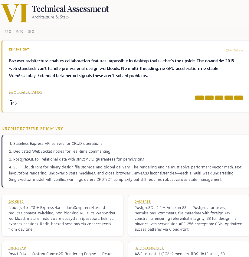3. Technical assessment — Architecture recommendations, complexity ratings, and a technical due diligence checklist identifying risks that could impact development timelines or feasibility.