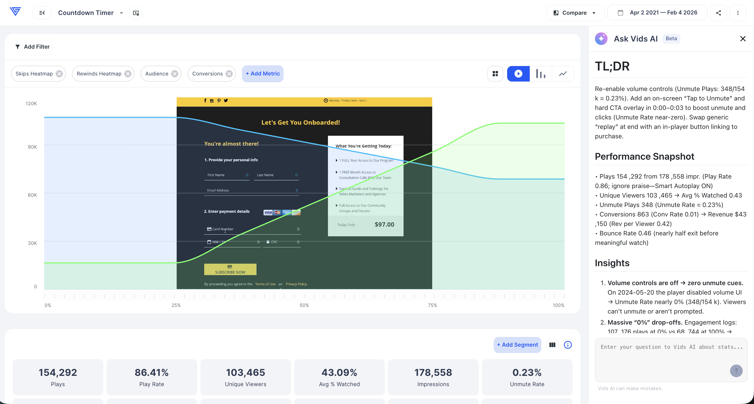 - Vids AI: Vids AI lives directly inside your video stats. With one click, it analyzes your video engagement and conversion data, summarizes what’s happening, and gives you specific recommendations based on your video type — so you know what to fix and where to focus. Built on billions of data points across the highest-performing VSLs, ads, and funnels in Vidalytics… Vids AI gives you the same clarity elite marketers use to scale.