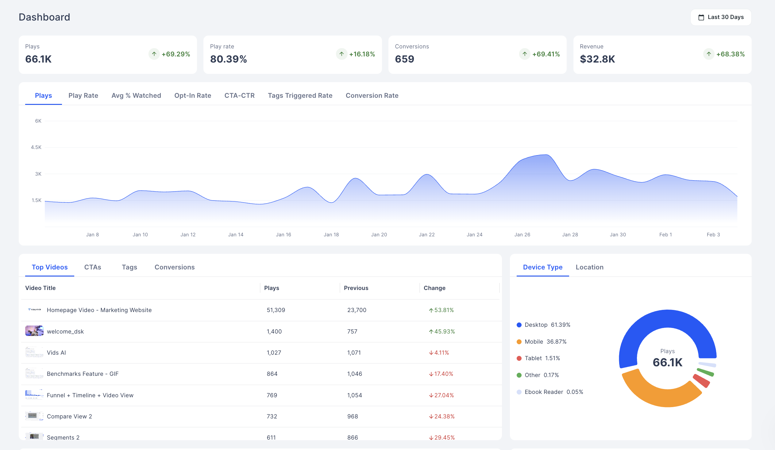 Vidalytics helps marketers understand, optimize, and scale video performance across websites, funnels, and campaigns. It combines secure video hosting, deep engagement analytics, conversion tracking, and industry-unique AI tools built specifically for marketing videos.