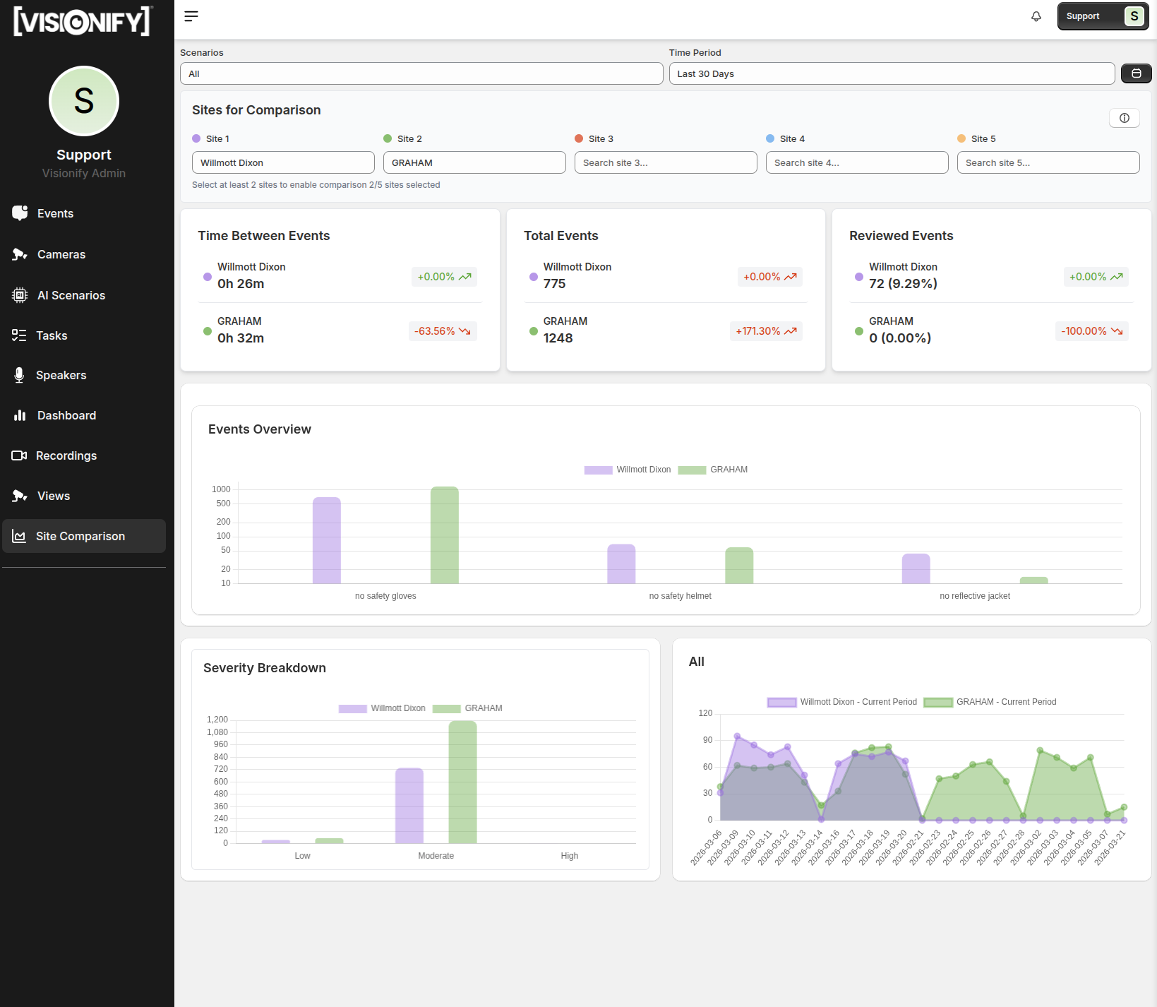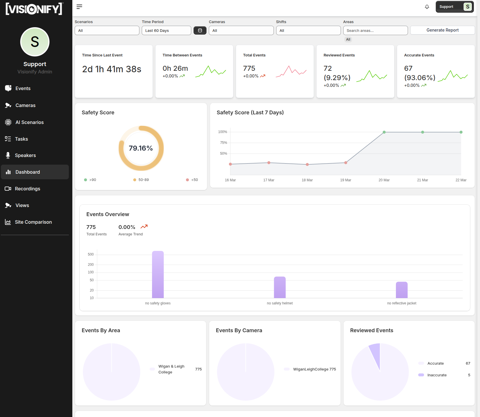 EHS Analytics Dashboard: Move from gut-feel safety management to data-driven decision making. Track violation trends, identify high-risk zones, benchmark safety performance across shifts and sites, and generate audit-ready compliance reports automatically.