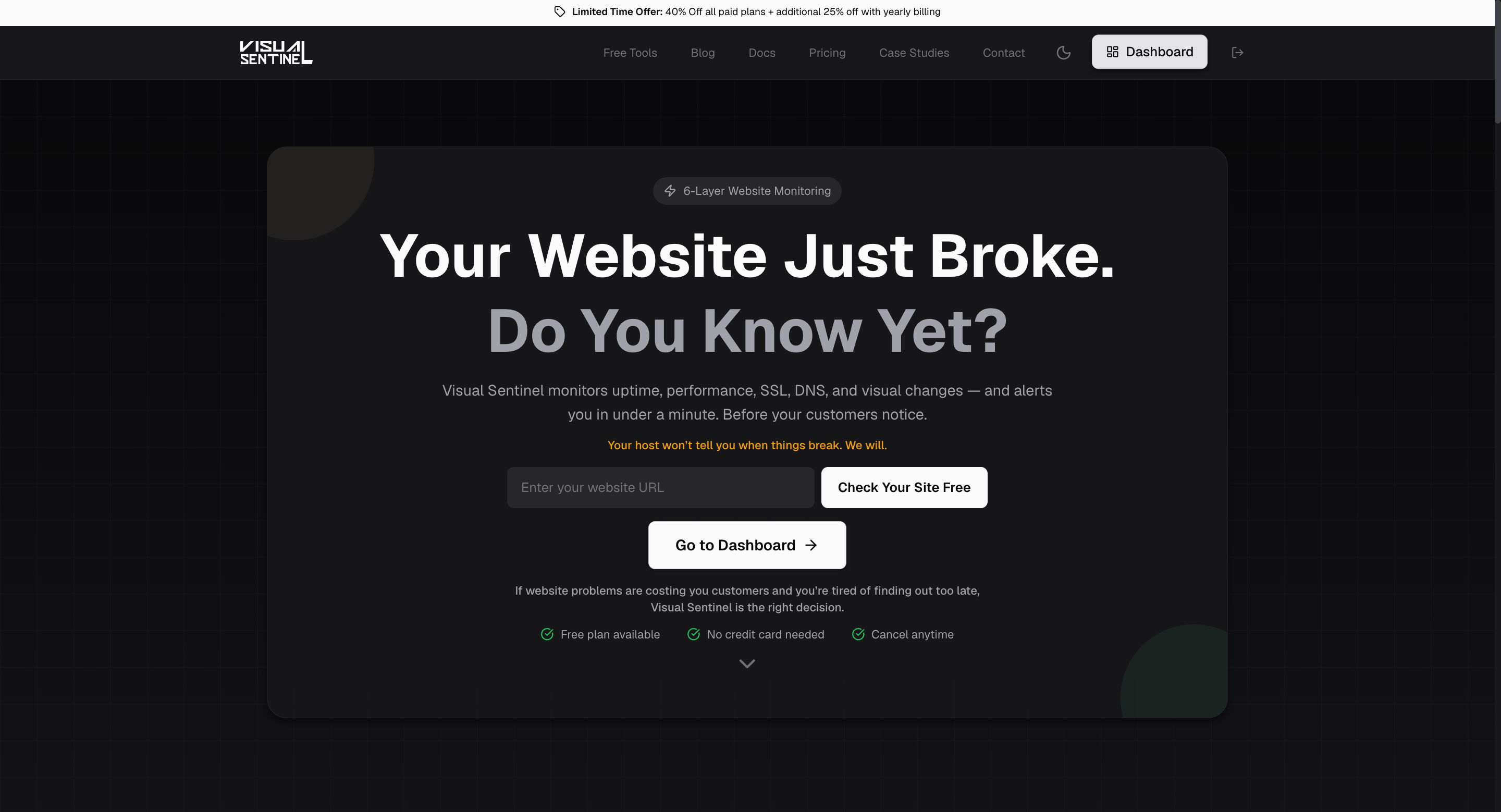 Visual Sentinel monitors 6 layers: Uptime, Performance, SSL, DNS, Visual Changes, and Content Integrity. Alerts via Email, Slack, Discord, WhatsApp, Telegram, and webhooks.