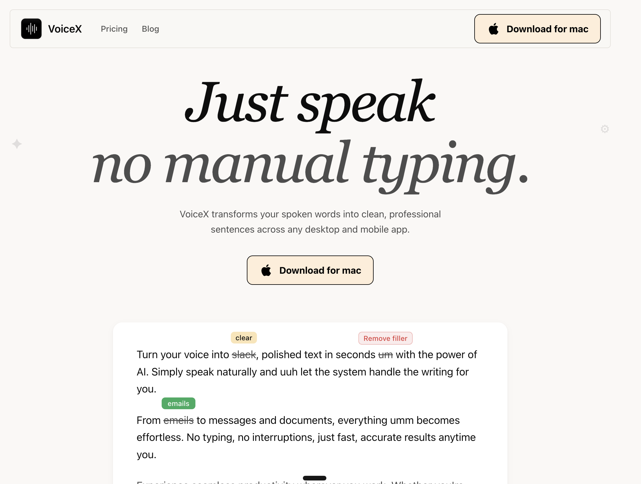 VoiceDash is an AI voice dictation tool that magically turns your spoken thoughts into beautifully formatted text, no matter the app, language, or device. Tap a hotkey on Windows, Mac, or mobile devices, start talking, and watch emails, docs, and chats fill up with punctuation-perfect prose. Need to switch from English to Spanish mid-sentence? We’ve got you. Want your late-night brain dump cleaned, capitalized, and ready to ship? Done!