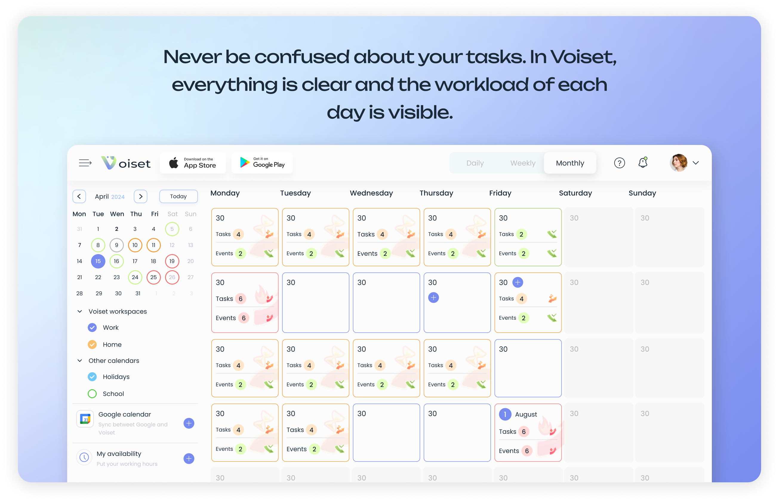 Voiset brings clarity by integrating everything in one place. You can connect external calendars and merge all your personal and professional events into a single master calendar. This gives you a complete overview of your schedule, helping you manage multiple projects and responsibilities with confidence and ease.