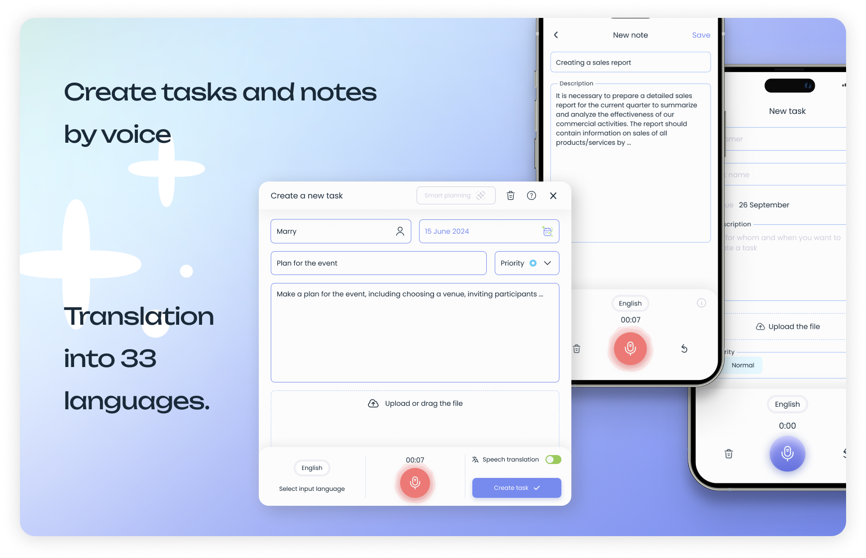 - Effortless Task Editing: Listen to the task in the audio file or make changes to the text description. Everything is fully editable, ensuring flexibility and adaptability to your workflow.