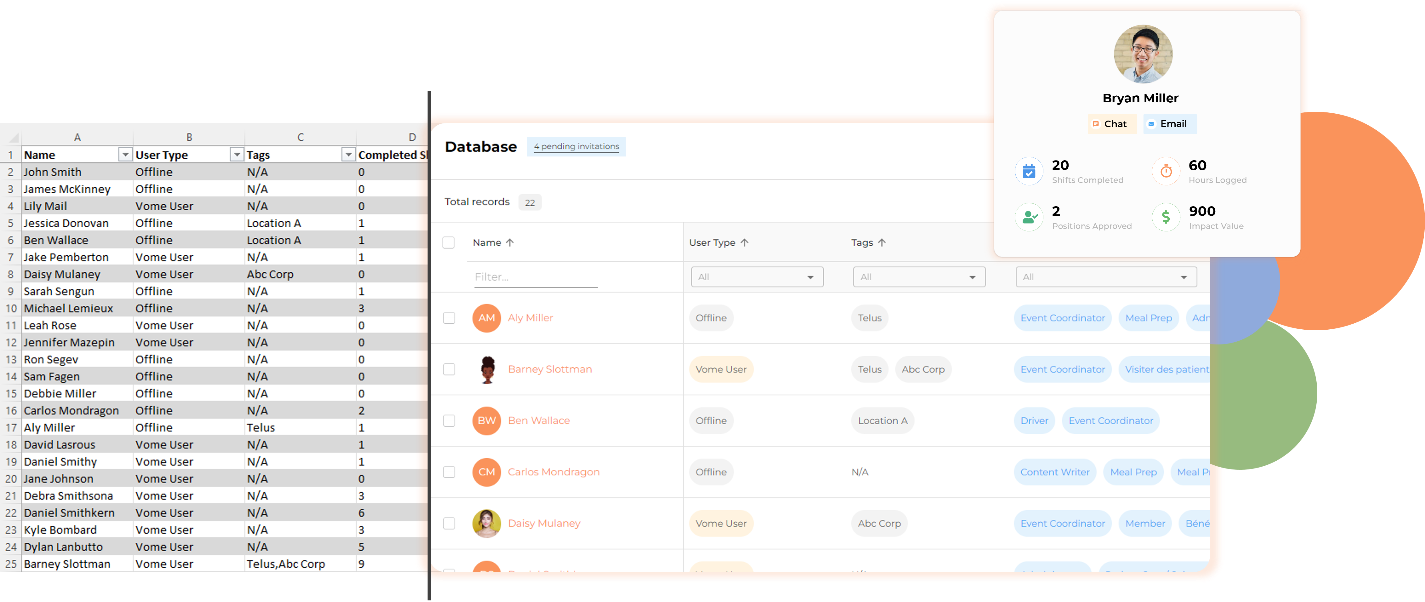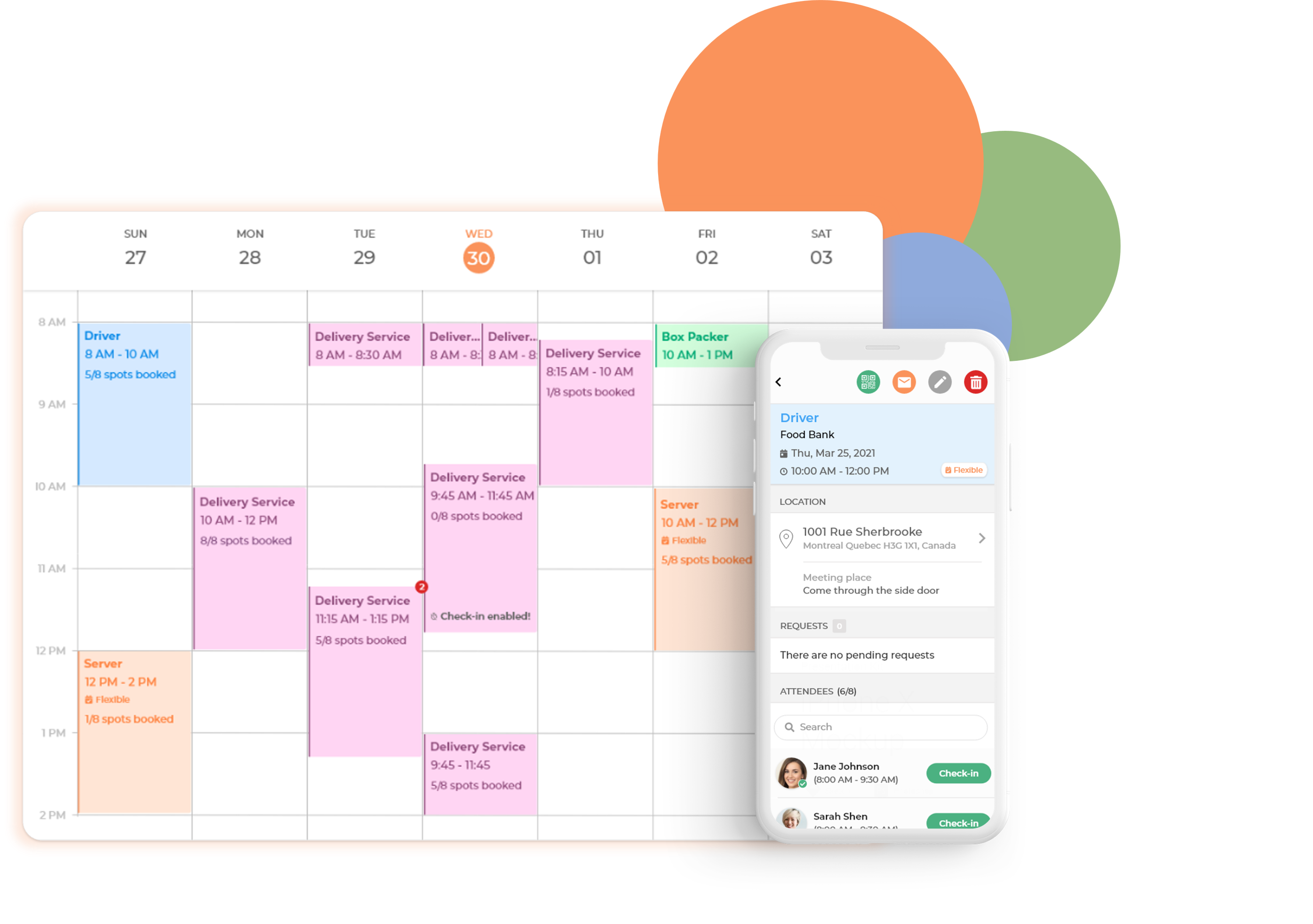 The platform can be used for internal management for the administrative team and/or for two-way user engagement. The latter gives the option to invite volunteers to claim a profile where they can easily reserve shifts, log hours, chat privately with admins or participate in group chats, and track their impact!