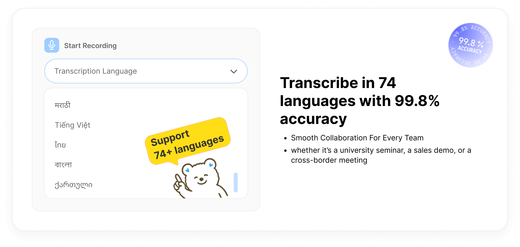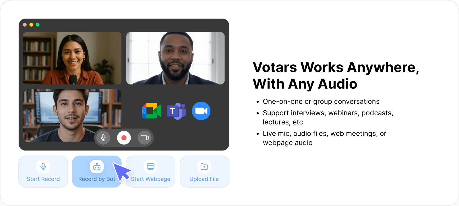 Whether you're running a Zoom call, a Google Meet webinar, a Teams sync, or uploading audio files, Votars adapts seamlessly to your workflow. Its flexible recording modes—including live mic capture, bot recording, and file upload—make it compatible with any meeting scenario. From one-on-one interviews to cross-functional project updates, Votars delivers crystal-clear transcripts with 99.8% accuracy and automatic speaker identification.