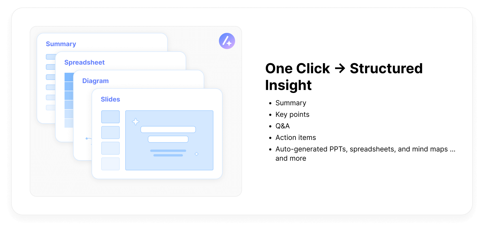 But Votars is more than a transcription tool. With just one click, it converts meeting data into structured outputs—such as summaries, key takeaways, Q&A lists, action items, and even slides, spreadsheets, and diagrams. These AI-generated deliverables save hours of manual note-taking and help teams move faster from discussion to execution.