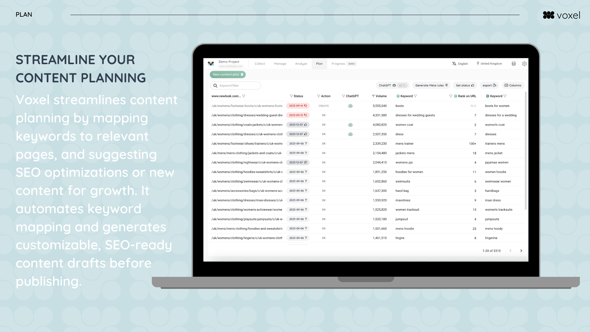 Voxel is probably the simplest way you'll make your day-to-day tasks as an SEO more effective. Not only will you become more effective, but also improve the quality of your work due to the numerous ways of collecting keywords, handling your data, clustering your keywords, and then putting your keywords into work and making them actionable with the help of the content plan. Review collected by and hosted on G2.com.