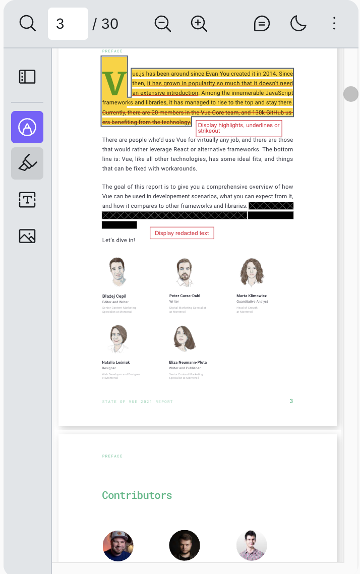 The Vue PDF viewer is straightforward to implement and functions very well. Additionally, the support team is extremely helpful. When I encountered an issue, I contacted support via email, and they responded immediately, making every effort to assist me. Review collected by and hosted on G2.com.