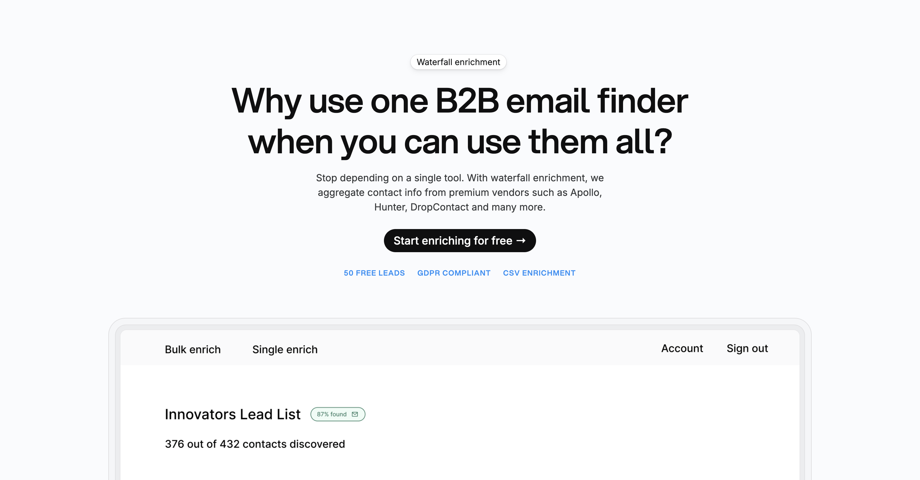 Quality and data coverage are amazing, got approx 93% of my prospects enriched with valid email addresses Review collected by and hosted on G2.com.