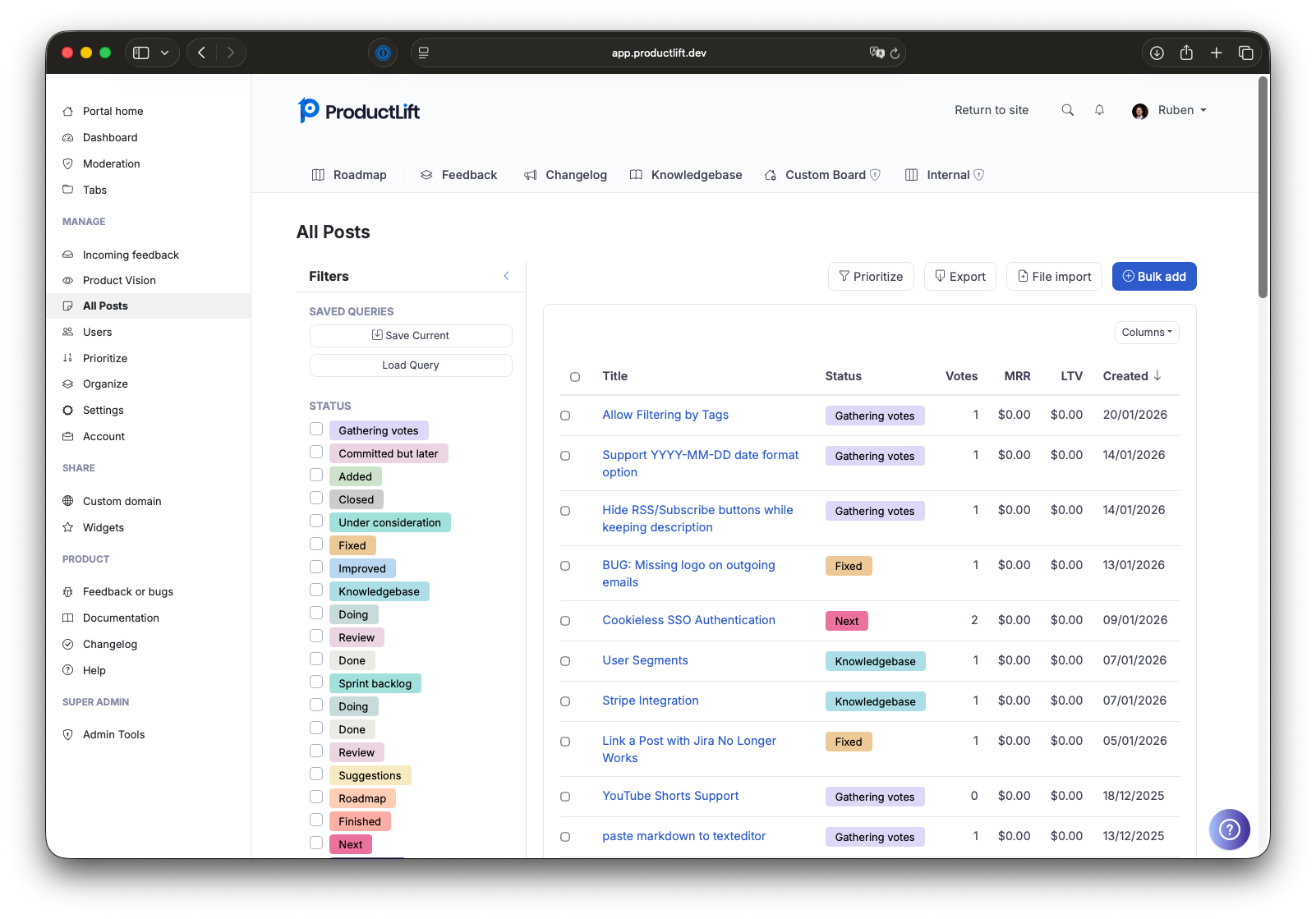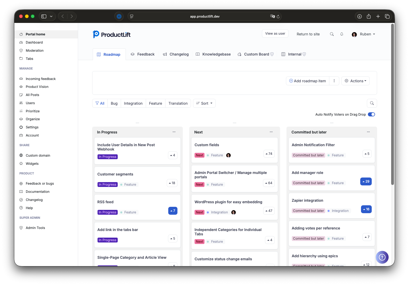 Centralizing feedback helps reduce the number of support messages we receive. It also eliminates the need for spreadsheets, databases and other SaaS apps to achieve what ProductLift does. Users can add to the "Wishlist" of things they would like to see added or changed. They can see the Roadmap of where we are going with the product both now and in the future. Additionally, they can vote on any item at any stage of the process as well as comment. This creates a clear picture for us of what the hot buttons are for the majority of users and guides us in planning what happens next. When the users see these changes happening via updates they feel a part of the company and its future. They know that we care.
