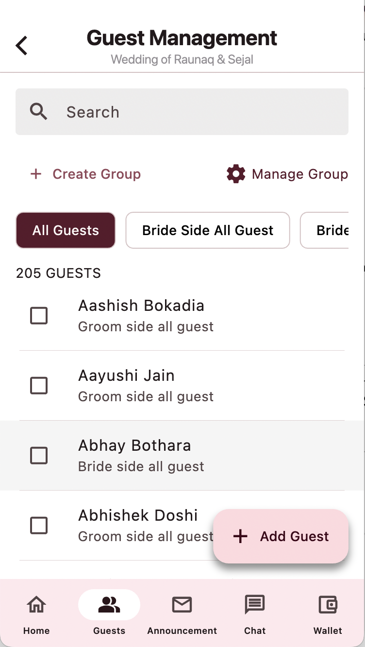 - Multi-event support across Mehendi, Sangeet, Wedding, Reception, Haldi, and Cocktail, all sharing one master guest list with per-event segmentation and per-guest attributes.