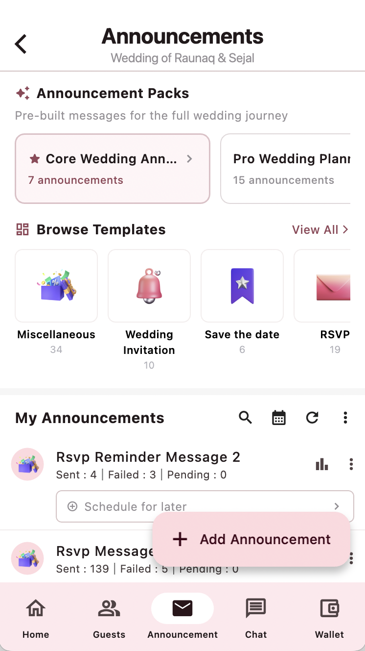 Weddingkart is a wedding management software solution that helps couples and event managers run Indian weddings on WhatsApp. It is an approved Meta WhatsApp Business Solution Provider (BSP) built specifically for weddings, used to manage guest lists at scale, send one-tap RSVP invitations and scheduled announcements on WhatsApp, coordinate vendors and travel, track per-guest message delivery, and run voice-agent RSVP collection across Hindi, English, and regional Indian languages.