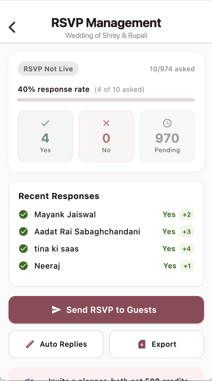 - AI voice agent that calls non-responders in Hindi, English, and regional Indian languages, captures structured RSVP, dietary, and plus-one data, and logs back to the dashboard.