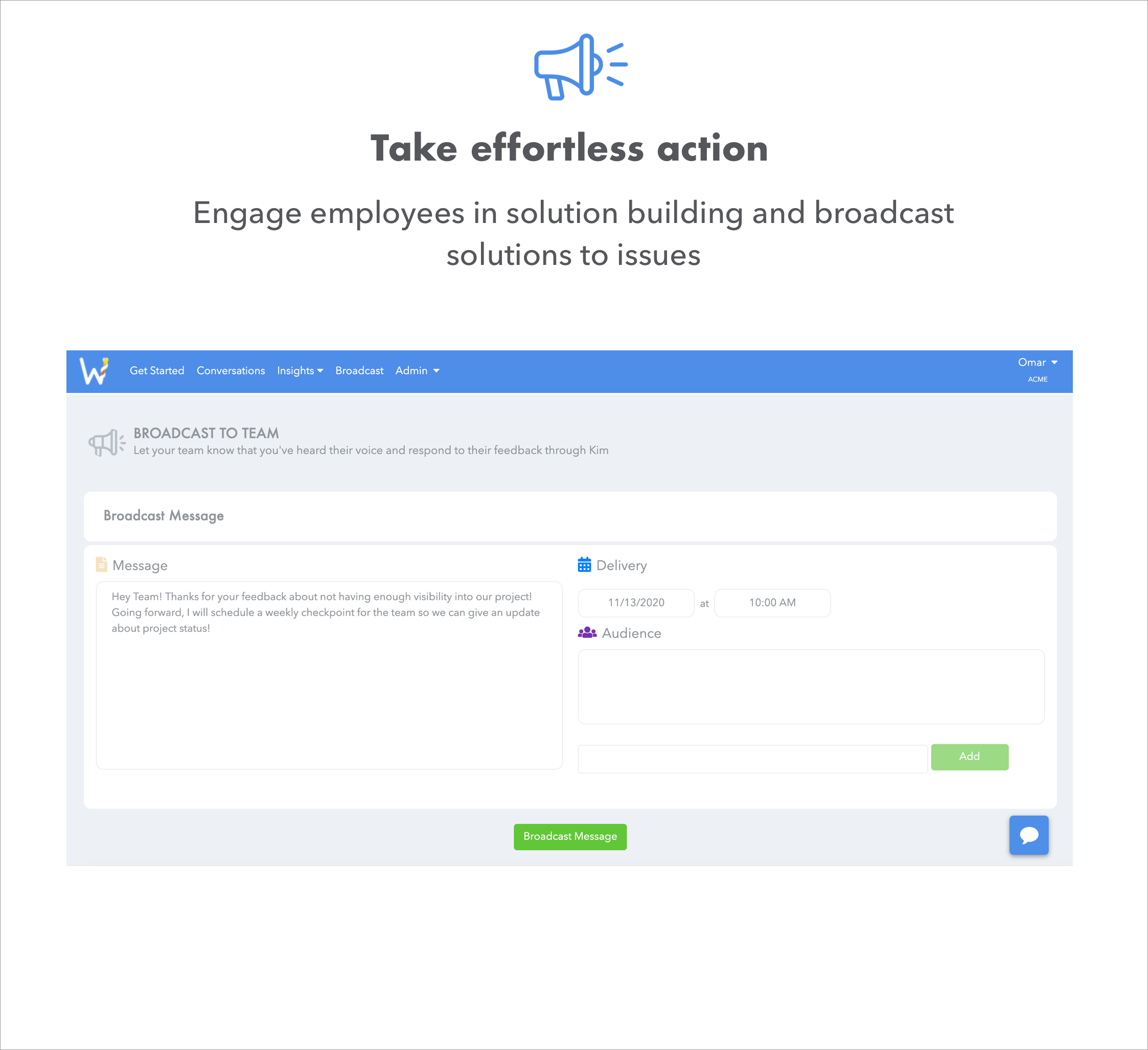 Engage employees in solution-building by crowdsourcing and broadcasting solutions to issues