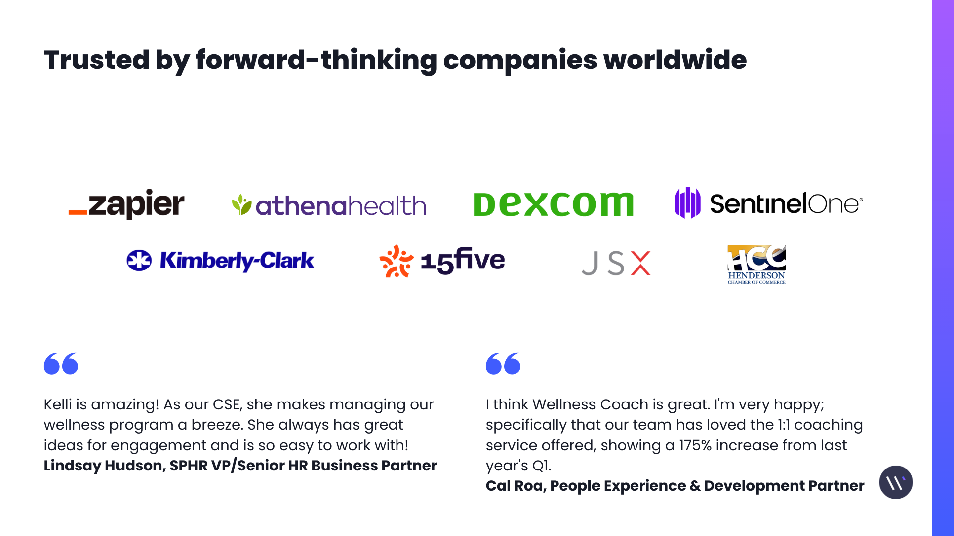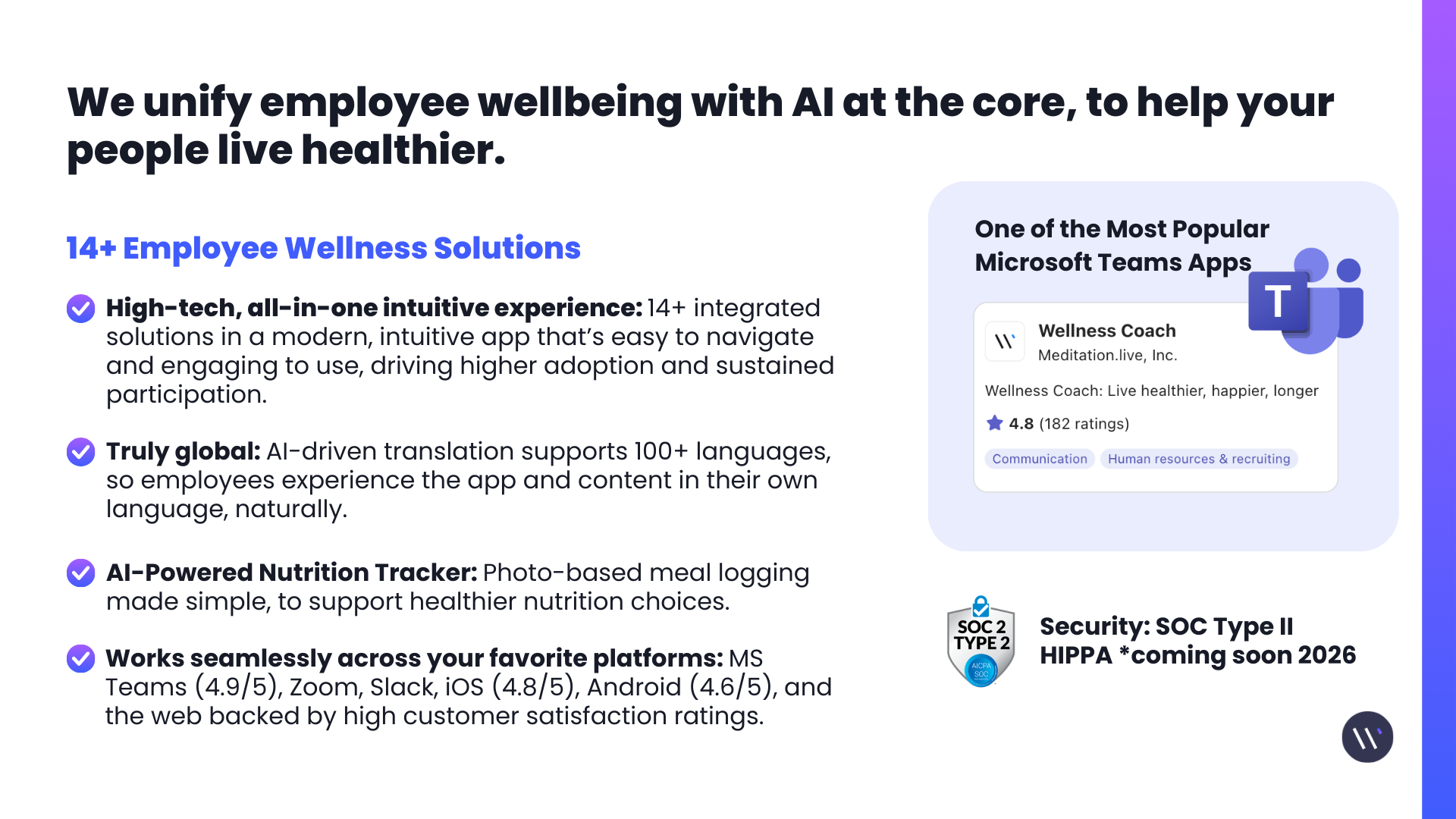 Wellness Coach is ideal for companies looking to foster a culture of wellness while managing the complexities of global operations. Its proven impact is reflected in its industry-leading credibility, boasting a 4.9-star rating on G2 and a 4.8-star rating on the App Store, backed by more than 4,000 user reviews. With support for over 125 languages, the platform ensures that all team members can access its resources regardless of their location, providing a trusted and inclusive experience for a global workforce.