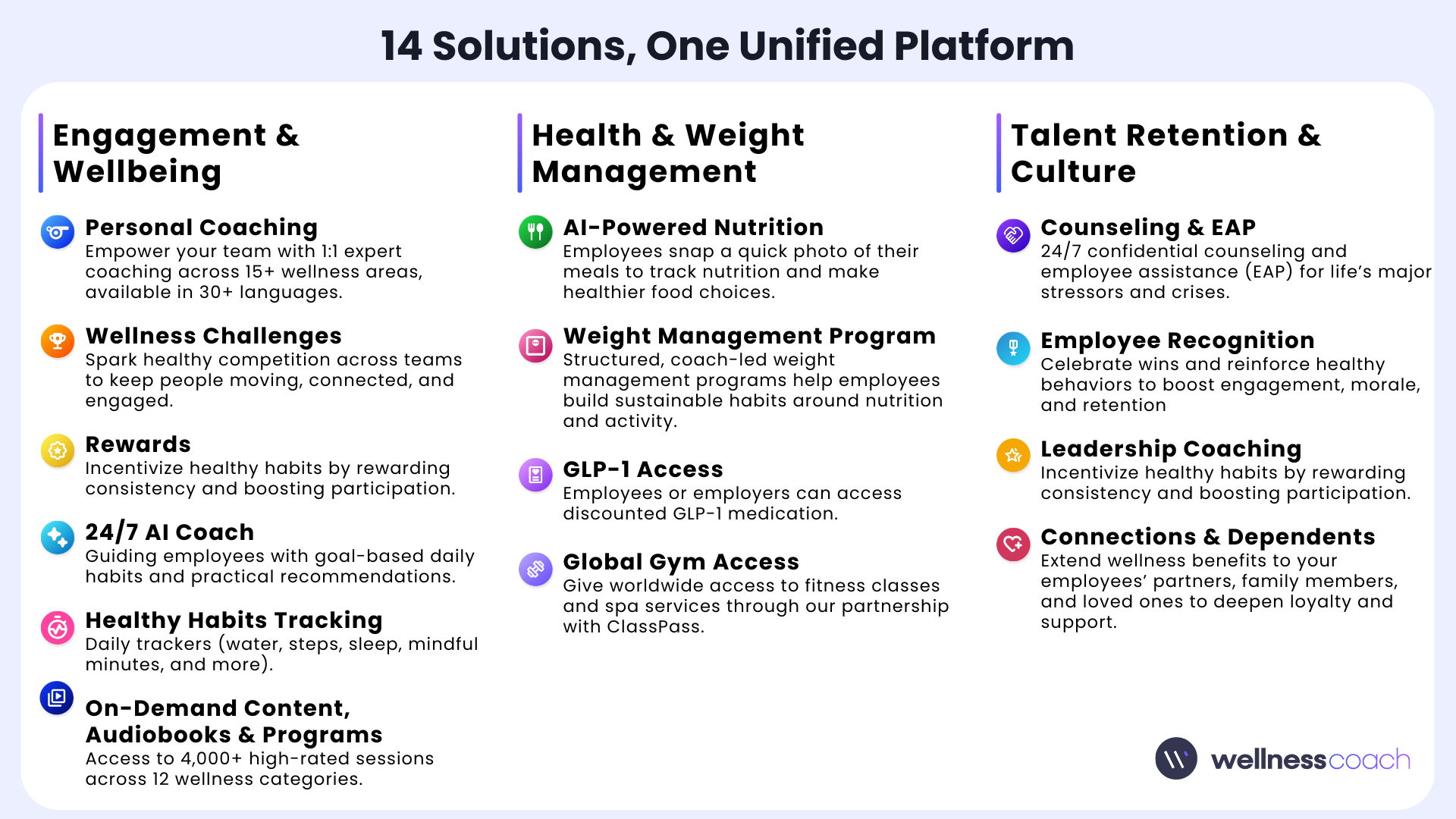 Wellness Coach offers a unique, integrated approach to employee wellness, making it easier for organizations to cultivate a thriving workplace. With over 14 specialized wellness solutions, we are confident that our platform provides the specific tools your team needs to promote lasting health, engagement, and retention.