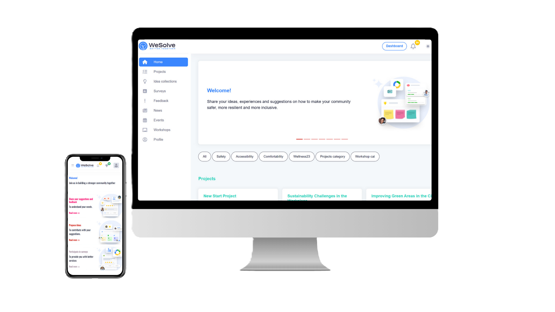 WeSolve on desktop and mobile — the platform's interface for collecting feedback, managing engagement workflows, and viewing input across devices.