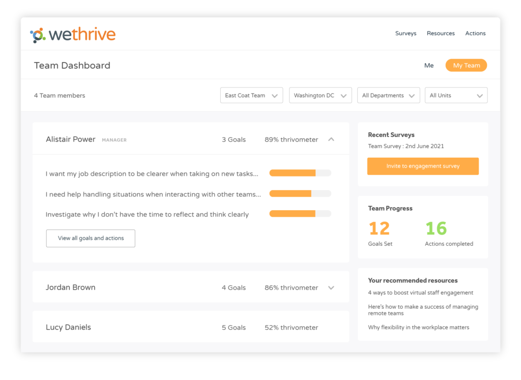 Intuitive and easy to use. It comes from the perspective of the employee, vs. the organization - which is really what we want to know about, and our workforce wants us to know. Love the international lens/viewpoints. The WeThrive team has been fantastic in providing support and made the implementation so easy. We integrated the platorm with our HRIS, and got great support in doing that. Review collected by and hosted on G2.com.