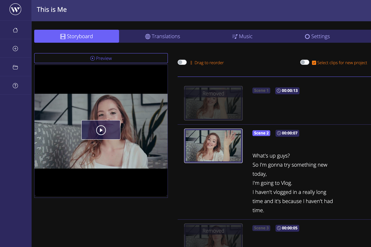 The tool generates a transcribed storyboard based on your speech, which lets you edit the video by editing the storyboard text—no video editing skills required!