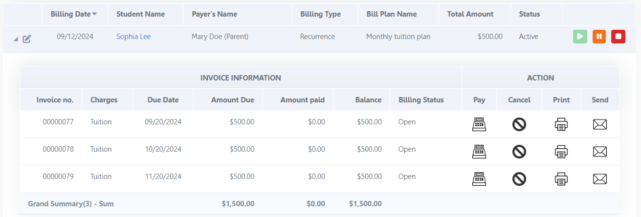 BILLING: Create and send an invoice to parents easily. Manage all billing transactions, payments, refunds & credits from the app.
