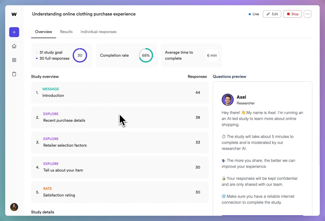 What I like about "Wondering" is its ease of setup, which makes it accessible and user-friendly. The AI follow-up questions are effective most of the time, and this feature is particularly valuable as it provides deeper insights by probing further into the user's responses. The control over the discussion guide is another aspect I appreciate, as it not only generates a polished draft but also allows me to add details or refine it further, often sparking new ideas I hadn't considered. Additionally, participants have mentioned that they enjoyed being interviewed in this manner, as it gave them the opportunity to think about their answers without the pressure of responding quickly, as they might in a human-led interview. Overall, "Wondering" offers a comprehensive and thoughtful approach to gathering insights. Review collected by and hosted on G2.com.