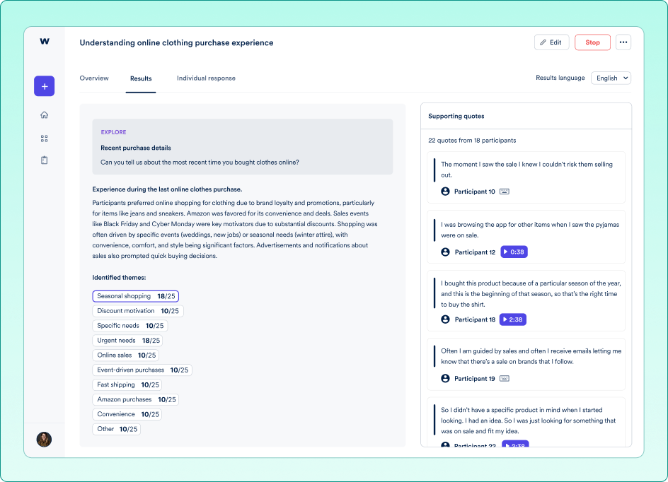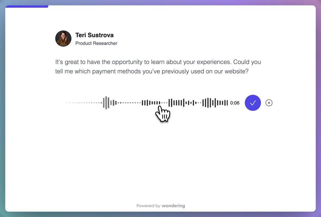 What I didn't like about "Wondering" is that while it offers analysis of the feedback, you still need to go through each recording or transcript to capture inflection and emotion, which are crucial. Much of the analysis seems to be based solely on the transcript, which can affect the insights. Setting the follow-up questions to four for each question makes for a very long interview, but setting it to two can result in incomplete responses if the first follow-up misinterprets something. For example, the AI thought one user said "surprise" when they actually said "price," leading to a follow-up question about what was "surprising," which wasted a follow-up question as the user had to clarify they said "price." Human emotion and making people comfortable are important, and while "Wondering" does a good job of this, I believe it is best for gathering initial feedback and should be complemented with a few human interviews to ensure a complete picture of what is happening. Review collected by and hosted on G2.com.
