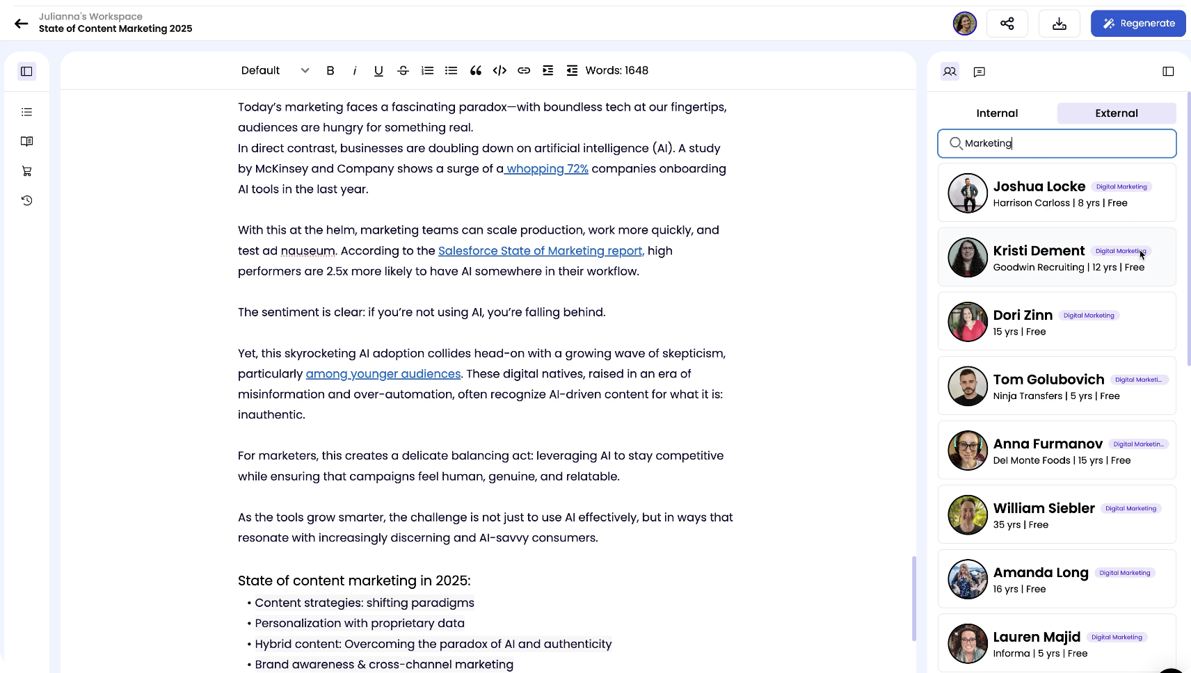 Need outside expertise? Instantly tap into Wordbrew’s vetted network of 500+ industry experts to enrich your content. Add credibility, drive thought leadership, and amplify reach when featured experts share your content.
