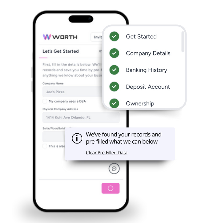 - Worth Pre-Fill: Pre-populates verified business data with just 3 fields